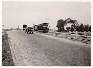 2a. Muiderstraatweg ca. 1939. Ook hier is te zien hoe weinig ruimte er al die jaren beschikbaar was. Er lag wel dubbel spoor en op de volgende foto is te zien hoe veel tram verkeer er gebruik van maakte (bron i.)