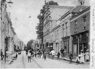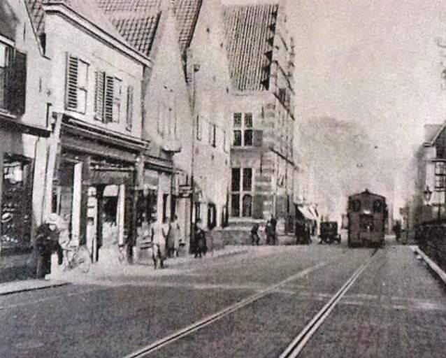 4*. Hier het hoekpand hoek welke een stuk moest prijsgeven om ruimte te maken voor de tram. Foto ca. 1900 (bron 2.)