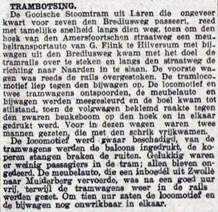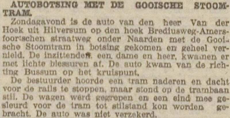 9b. Op 30 november 1926 vindt er op dezelfde kruising een ongeval plaats tussen de tram en een personenwagen uit Hilversum. De inzittenden, een man en een vrouw, raakten slechts licht gewond (bron g.)