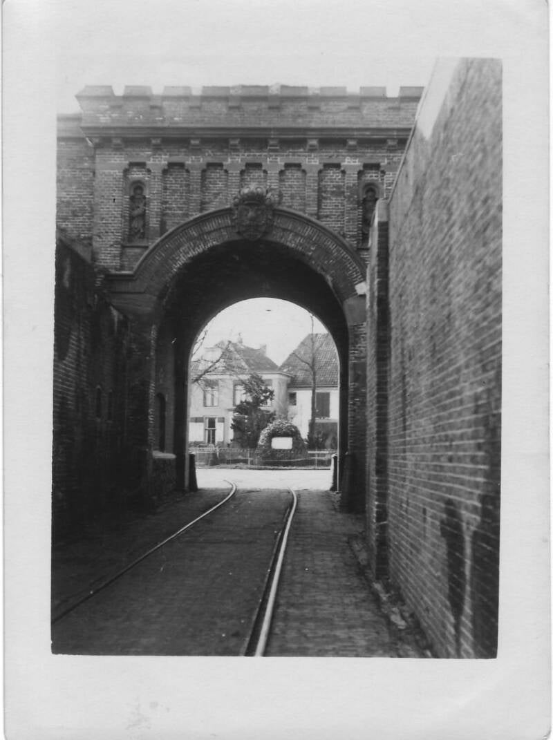 6d. Een krappe doorgang voor de tram. In de nog altijd bestaande Utrechtsepoort is nog altijd op het plafond van de boor een roetspoor te zien van de stoomtrams. Foto van 1925 (bron Percy Poolman NONF)